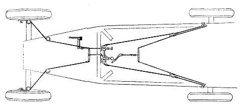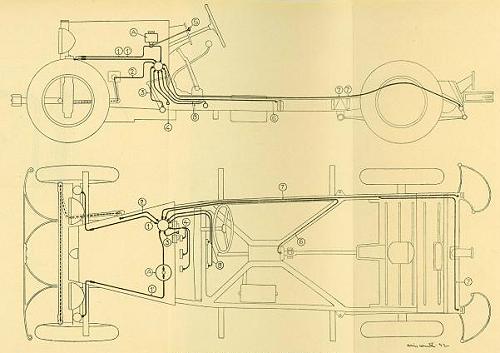 Sempre sul cruscotto si trovava un tirante che azionato manualmente ogni 100-150 Km comandava il sistema di lubrificazione centralizzata Bijur che portava, mediante sottili tubi di rame, l'olio sotto pressione a: sospensioni anteriori, snodi della tiranteria dello sterzo, supporti pedaliera, forcella di comando della frizione e cuscinetto reggispinta, albero rinvio freni, cuscinetto centrale oscillante dell'albero di trasmissione ed ai biscottini posteriori delle balestre. Figura 6 Schema della lubrificazione centralizzata del telaio