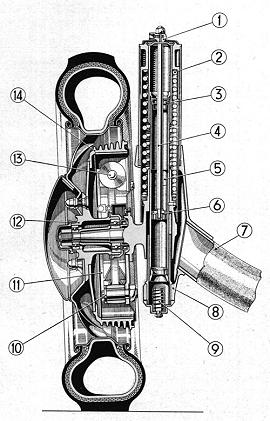 Il cavo posteriore era in un pezzo unico, partendo da una ruota passava attraverso l'albero di comando della pedaliera e tornava all'altra ruota. Figura 12 Particolare del sistema di regolazione dei freni.